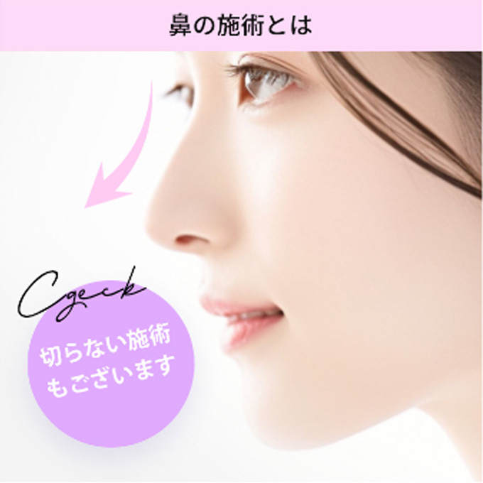 鼻を高くしたい・鼻筋を通したい・鼻先をスッキリ尖らせたいなどのお悩み別に、「鼻筋・隆鼻術」、「鼻尖形成」、「小鼻縮小」の3つの施術をご提案しております。